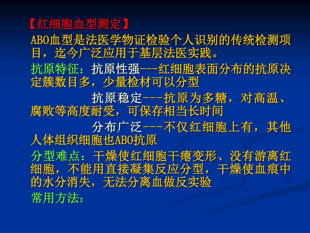 【红细胞血型测定】 ABO血型是法医学物证检验个人识别的传统检测项目,迄今广泛应用于基层法医实践。 抗原特征:抗原性强---红细胞表面分布的抗原决定簇数目多,少量检材可以分型 抗原稳定---抗原为多糖,对高温、腐败等高度耐受,可保存相当长时间 分布广泛---不仅红细胞上有,其他人体组织细胞也ABO抗原 分型难点:干燥使红细胞干瘪变形、没有游离红细胞,不能用直接凝集反应分型,干燥使血痕中的水分消失,无法分离血做反实验 常用方法:
