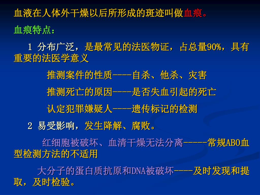 血液在人体外干燥以后所形成的斑迹叫做血痕。血液在人体外干燥以后所形成的斑迹叫做血痕。 血痕特点: 1 分布广泛,是最常见的法医物证,占总量90%,具有重要的法医学意义 推测案件的性质----自杀、他杀、灾害 推测死亡的原因----是否失血引起的死亡 认定犯罪嫌疑人----遗传标记的检测 2 易受影响,发生降解、腐败。 红细胞被破坏、血清干燥无法分离-----常规ABO血型检测方法的不适用 大分子的蛋白质抗原和DNA被破坏----及时发现和提取,及时检验。
