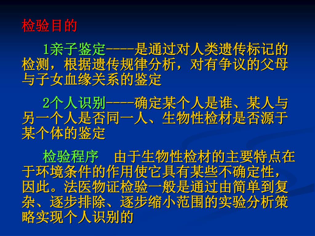 检验目的 1亲子鉴定----是通过对人类遗传标记的检测,根据遗传规律分析,对有争议的父母与子女血缘关系的鉴定 2个人识别----确定某个人是谁、某人与另一个人是否同一人、生物性检材是否源于某个体的鉴定 检验程序 由于生物性检材的主要特点在于环境条件的作用使它具有某些不确定性,因此。法医物证检验一般是通过由简单到复杂、逐步排除、逐步缩小范围的实验分析策略实现个人识别的