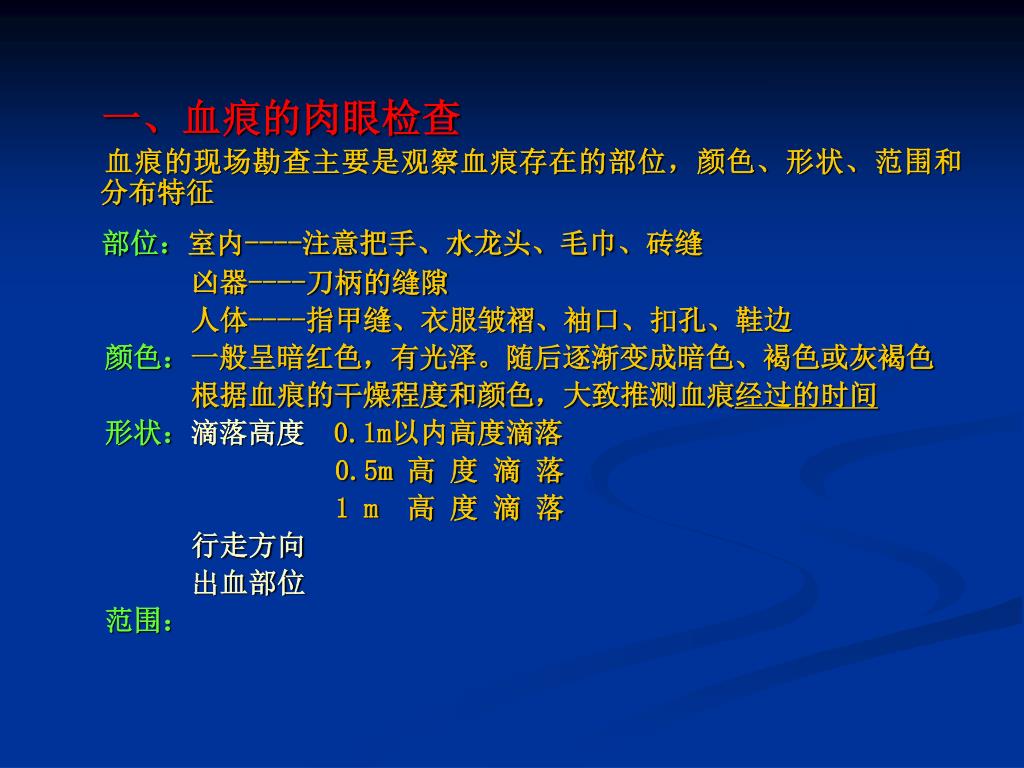 一、血痕的肉眼检查 血痕的现场勘查主要是观察血痕存在的部位,颜色、形状、范围和分布特征 部位:室内----注意把手、水龙头、毛巾、砖缝 凶器----刀柄的缝隙 人体----指甲缝、衣服皱褶、袖口、扣孔、鞋边 颜色:一般呈暗红色,有光泽。随后逐渐变成暗色、褐色或灰褐色 根据血痕的干燥程度和颜色,大致推测血痕经过的时间 形状:滴落高度 0.1m以内高度滴落 0.5m 高 度 滴 落 1 m 高 度 滴 落 行走方向 出血部位 范围: