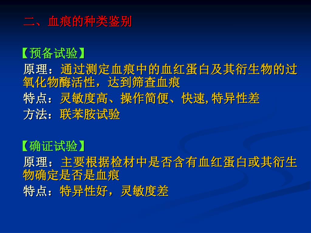 二、血痕的种类鉴别 【预备试验】 原理:通过测定血痕中的血红蛋白及其衍生物的过氧化物酶活性,达到筛查血痕 特点:灵敏度高、操作简便、快速,特异性差 方法:联苯胺试验 【确证试验】 原理:主要根据检材中是否含有血红蛋白或其衍生物确定是否是血痕 特点:特异性好,灵敏度差