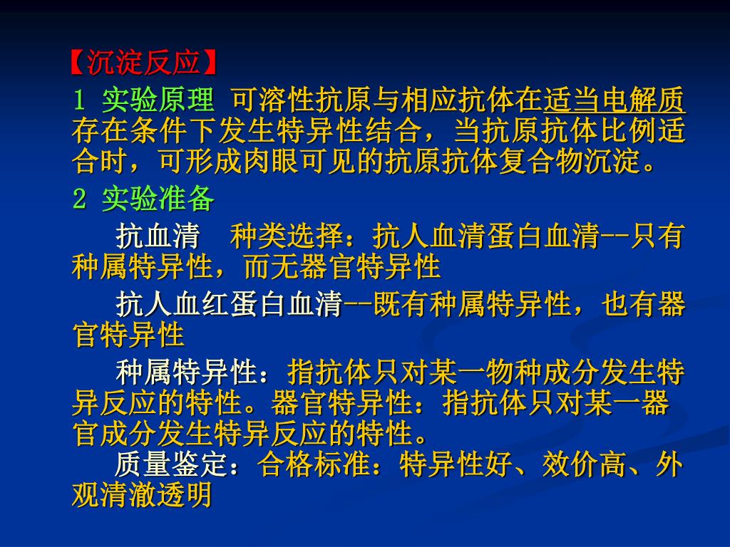 【沉淀反应】 1 实验原理 可溶性抗原与相应抗体在适当电解质存在条件下发生特异性结合,当抗原抗体比例适合时,可形成肉眼可见的抗原抗体复合物沉淀。 2 实验准备 抗血清 种类选择:抗人血清蛋白血清--只有种属特异性,而无器官特异性 抗人血红蛋白血清--既有种属特异性,也有器官特异性 种属特异性:指抗体只对某一物种成分发生特异反应的特性。器官特异性:指抗体只对某一器官成分发生特异反应的特性。质量鉴定:合格标准:特异性好、效价高、外观清澈透明