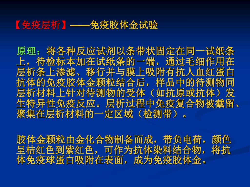 【免疫层析】——免疫胶体金试验 原理:将各种反应试剂以条带状固定在同一试纸条上,待检标本加在试纸条的一端,通过毛细作用在层析条上渗滤、移行并与膜上吸附有抗人血红蛋白抗体的免疫胶体金颗粒结合后,样品中的待测物同层析材料上针对待测物的受体(如抗原或抗体)发生特异性免疫反应。层析过程中免疫复合物被截留、聚集在层析材料的一定区域(检测带)。 胶体金颗粒由金化合物制备而成,带负电荷,颜色呈桔红色到紫红色,可作为抗体染料结合物,将抗体免疫球蛋白吸附在表面,成为免疫胶体金。