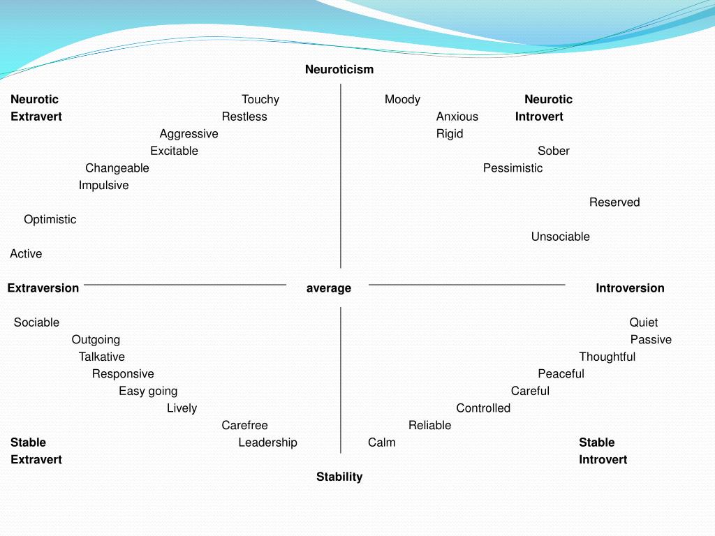 Neuroticism Neurotic Touchy Moody Neurotic Extravert Restless Anxious Introvert Aggressive Rigid Excitable Sober Changeable Pessimistic Impulsive Reserved Optimistic Unsociable Active Extraversion average Introversion Sociable Quiet Outgoing Passive Talkative Thoughtful Responsive Peaceful Easy going Careful Lively Controlled Carefree Reliable Stable Leadership Calm Stable Extravert Introvert Stability