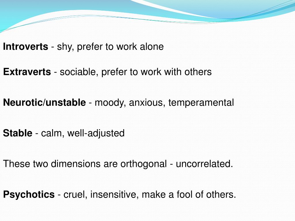 Introverts- shy, prefer to work alone Extraverts - sociable, prefer to work with others Neurotic/unstable - moody, anxious, temperamental Stable - calm, well-adjusted These two dimensions are orthogonal - uncorrelated. Psychotics - cruel, insensitive, make a fool of others.