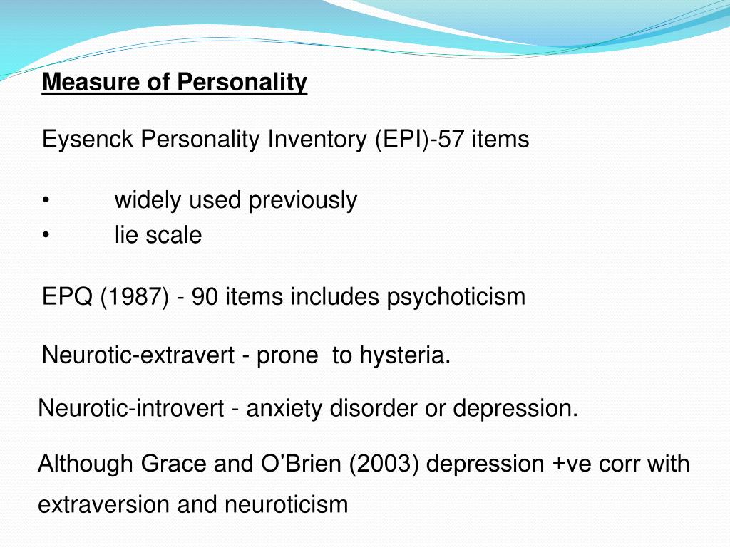 Measure of Personality • Eysenck Personality Inventory (EPI)-57 items • widely used previously • lie scale • EPQ (1987) - 90 items includes psychoticism • Neurotic-extravert - prone to hysteria. Neurotic-introvert - anxiety disorder or depression. Although Grace and O’Brien (2003) depression +ve corr with extraversion and neuroticism