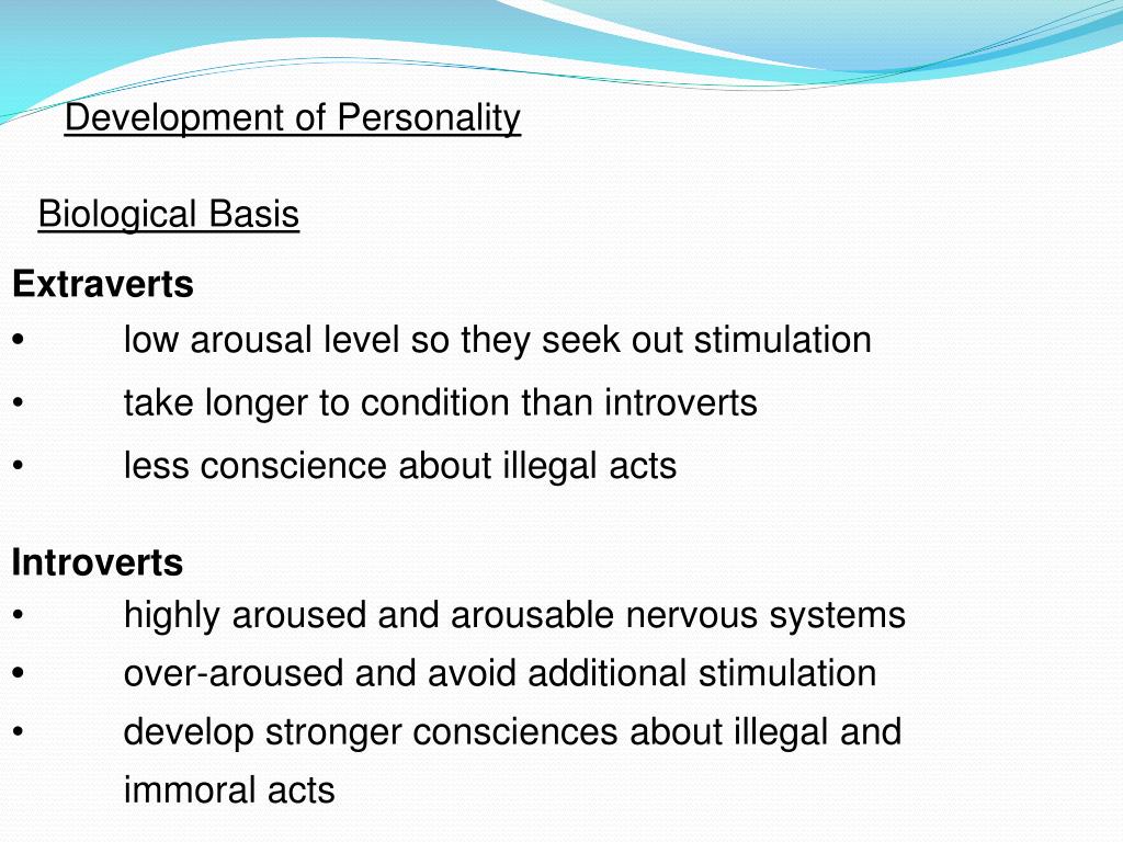 Development of Personality Biological Basis Extraverts • low arousal level so they seek out stimulation • take longer to condition than introverts • less conscience about illegal acts Introverts • highly aroused and arousable nervous systems • over-aroused and avoid additional stimulation • develop stronger consciences about illegal and immoral acts