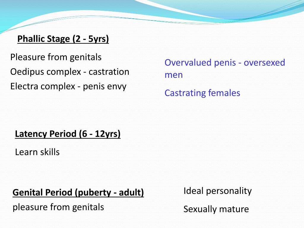 Phallic Stage (2 - 5yrs) Pleasure from genitals Oedipus complex - castration Electra complex - penis envy Overvalued penis - oversexed men Castrating females Latency Period (6 - 12yrs) Learn skills Ideal personality Sexually mature Genital Period (puberty - adult) pleasure from genitals