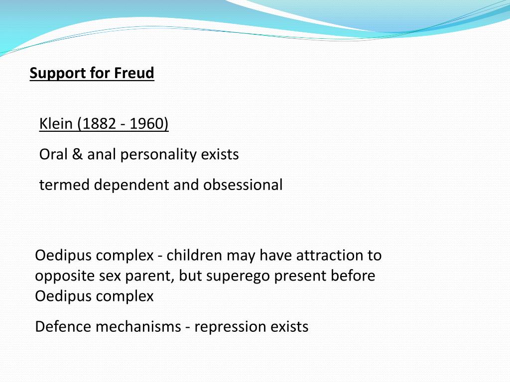 Support for Freud Klein (1882 - 1960) Oral & anal personality exists termed dependent and obsessional Oedipus complex - children may have attraction to opposite sex parent, but superego present before Oedipus complex Defence mechanisms - repression exists