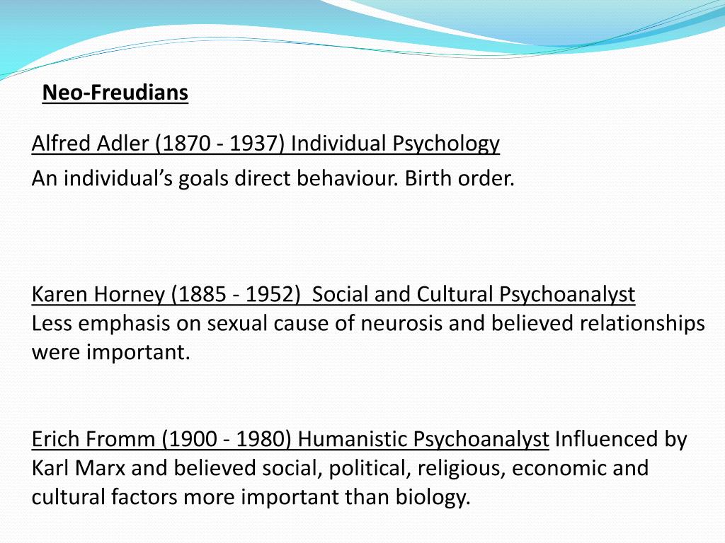 Neo-Freudians Alfred Adler (1870 - 1937) Individual Psychology An individual’s goals direct behaviour. Birth order. Karen Horney (1885 - 1952) Social and Cultural Psychoanalyst Less emphasis on sexual cause of neurosis and believed relationships were important. Erich Fromm (1900 - 1980) Humanistic Psychoanalyst Influenced by Karl Marx and believed social, political, religious, economic and cultural factors more important than biology.