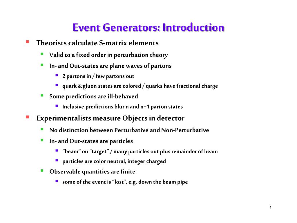 Event Generators: Introduction. Theorists calculate S-matrix elements Valid to a fixed order in perturbation theory In- and Out-states are plane waves of partons 2 partons in / few partons out quark & gluon states are colored / quarks have fractional charge Some predictions are ill-behaved