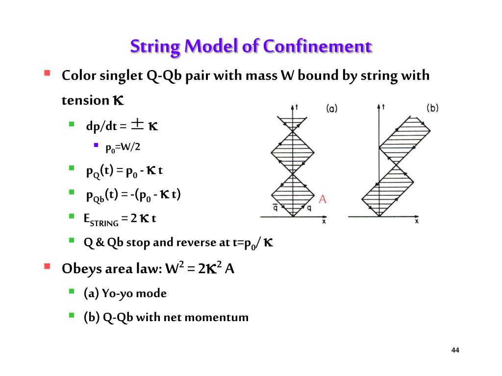 String Model of Confinement • Color singlet Q-Qb pair with mass W bound by string with tension • dp/dt = ± • p0=W/2 • pQ(t) = p0 - t • pQb(t) = -(p0 - t) • ESTRING = 2 t • Q & Qb stop and reverse at t=p0/ • Obeys area law: W2 = 22 A • (a) Yo-yo mode • (b) Q-Qb with net momentum A