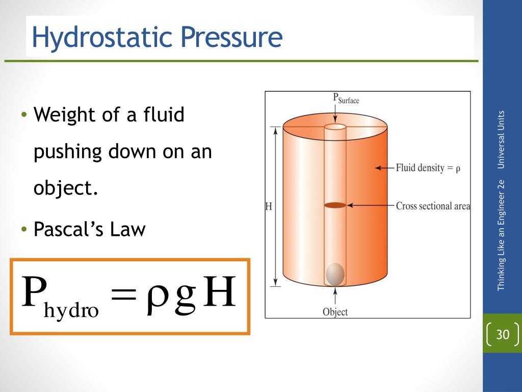 Hydrostatic Pressure • Weight of a fluid pushing down on an object. • Pascal’s Law Thinking Like an Engineer 2e