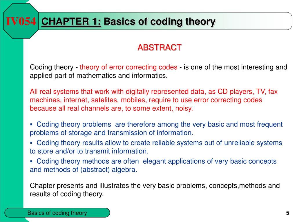 IV054 CHAPTER 1:Basics of coding theory • ABSTRACT • Coding theory - theory of error correcting codes - is one of the most interesting and applied part ofmathematics and informatics. • All real systems that work with digitally represented data, as CD players, TV, fax machines, internet, satelites, mobiles, require to use error correcting codes because all realchannels are, to some extent, noisy. • Coding theory problems are therefore among the very basic and most frequentproblems of storage and transmission of information. • Coding theory results allow to create reliable systems out ofunreliable systems to store and/or to transmit information. • Coding theory methods are often elegant applications of verybasic concepts and methods of (abstract) algebra. • Chapter presents and illustrates the very basic problems, concepts,methods and results of coding theory. Basics of coding theory