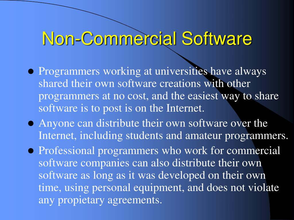 Non-Commercial Software • Programmers working at universities have always shared their own software creations with other programmers at no cost, and the easiest way to share software is to post is on the Internet. • Anyone can distribute their own software over the Internet, including students and amateur programmers. • Professional programmers who work for commercial software companies can also distribute their own software as long as it was developed on their own time, using personal equipment, and does not violate any propietary agreements.