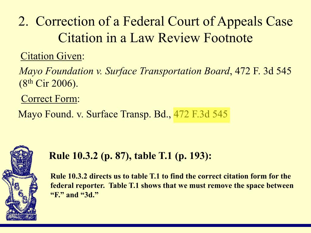 2. Correction of a Federal Court of Appeals Case Citation in a Law Review Footnote Citation Given: Mayo Foundation v. Surface Transportation Board, 472 F. 3d 545 (8th Cir 2006). Correct Form: Mayo Found. v. Surface Transp. Bd., 472 F.3d 545 Rule 10.3.2 (p. 87), table T.1 (p. 193): Rule 10.3.2 directs us to table T.1 to find the correct citation form for the federal reporter. Table T.1 shows that we must remove the space between “F.” and “3d.”
