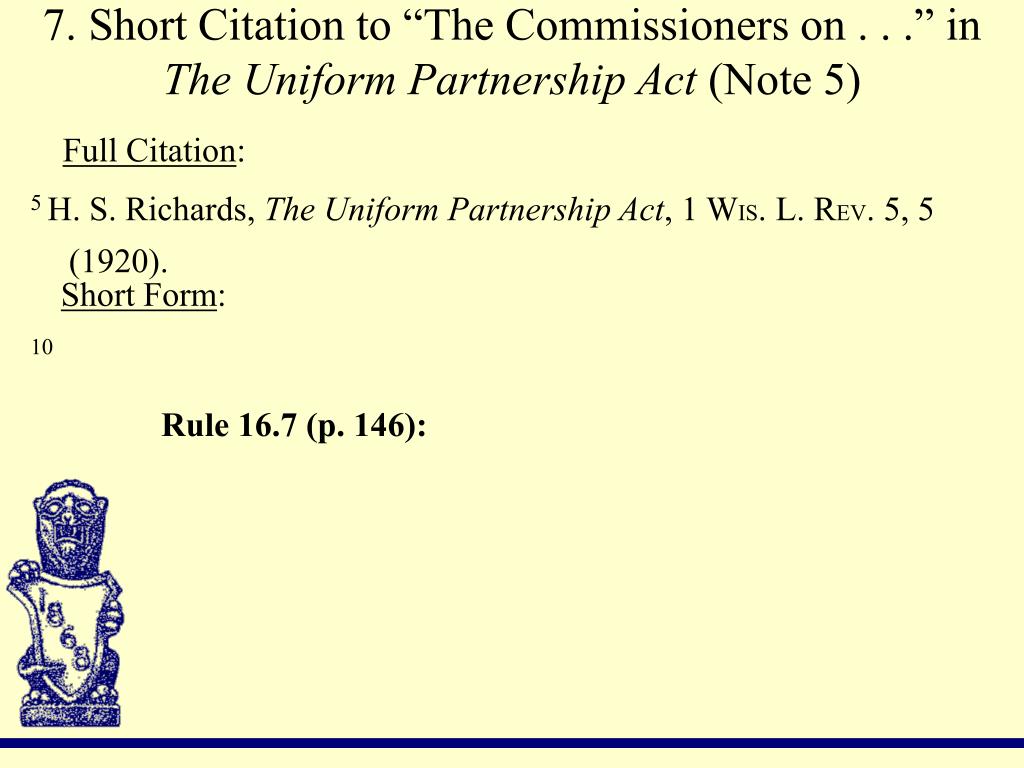 7. Short Citation to “The Commissioners on . . .” in The Uniform Partnership Act (Note 5) Full Citation: 5 H. S. Richards, The Uniform Partnership Act, 1 WIS. L. REV. 5, 5 (1920). Short Form: 10 Richards, supra note 5, at 5. Rule 16.7 (p. 146), rule 4.2 (66): The correct short form citation appears above.