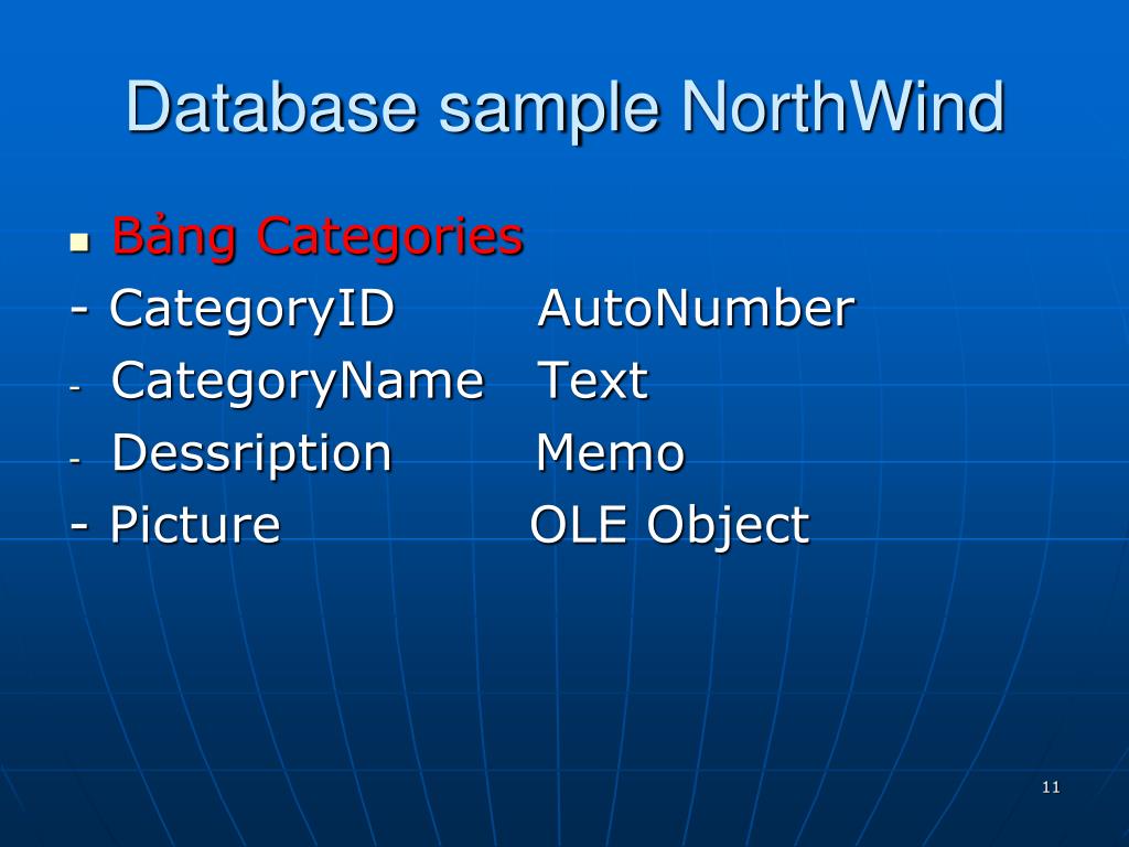 Database sample NorthWind • Bảng Categories - CategoryID AutoNumber • CategoryName Text • Dessription Memo - Picture OLE Object