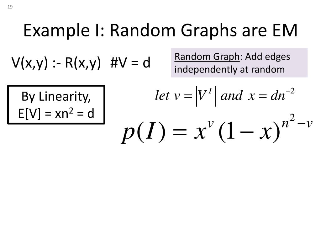 Example I: Random Graphs are EM Random Graph: Add edges independently at random V(x,y) :- R(x,y) #V = d By Linearity, E[V] = xn2 = d