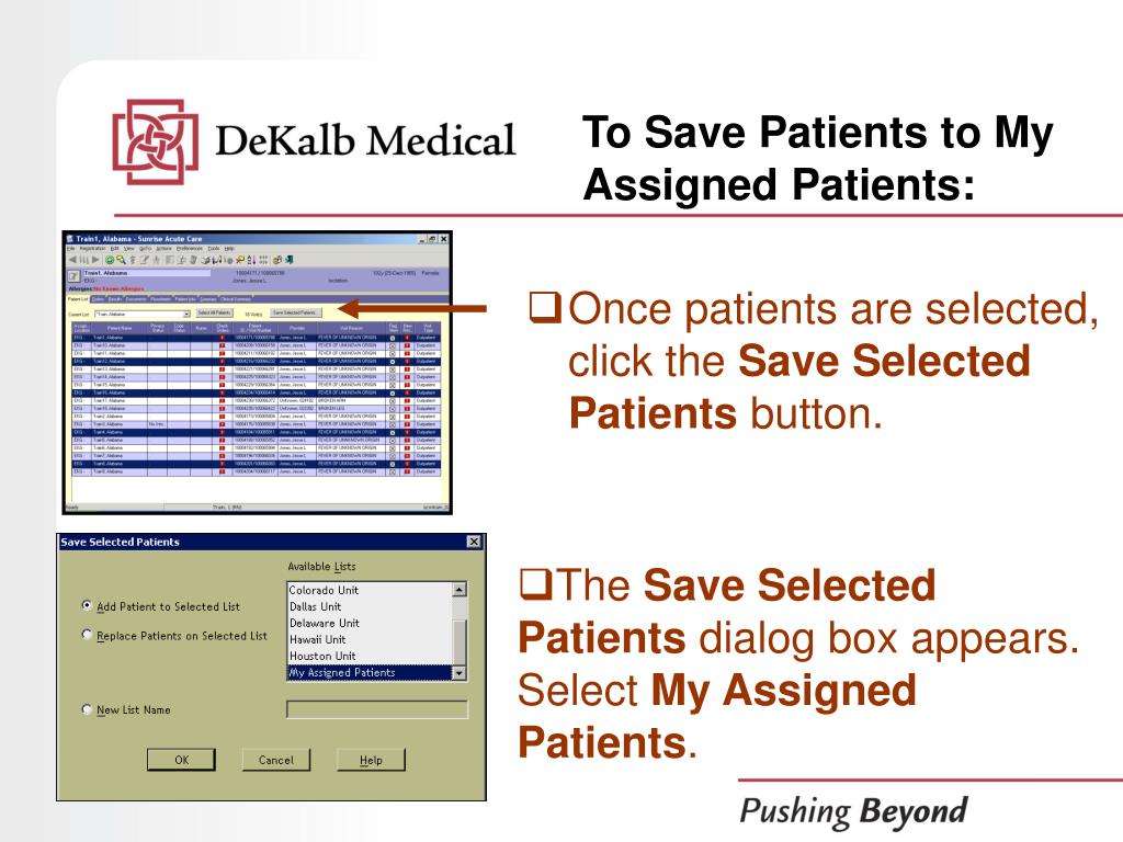 To Save Patients to My Assigned Patients: • Select the patients you would like to save, you can select patients sequentially or randomly • To select patients sequentially from the patient list, click the first patient name and continue to depress and drag the mouse to highlight as many patients down the list as you want to select.
