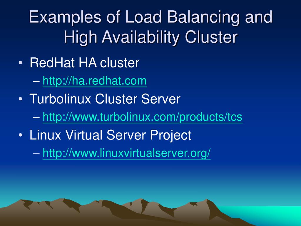 Examples of Load Balancing and High Availability Cluster • RedHat HA cluster • http://ha.redhat.com • Turbolinux Cluster Server • http://www.turbolinux.com/products/tcs • Linux Virtual Server Project • http://www.linuxvirtualserver.org/