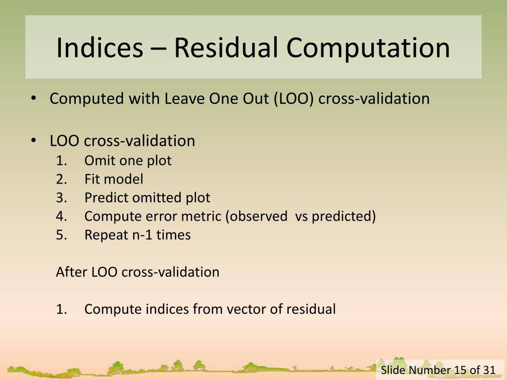Indices – Residual Computation • Computed with Leave One Out (LOO) cross-validation • LOO cross-validation • Omit one plot • Fit model • Predict omitted plot • Compute error metric (observed vs predicted) • Repeat n-1 times After LOO cross-validation • Compute indices from vector of residual