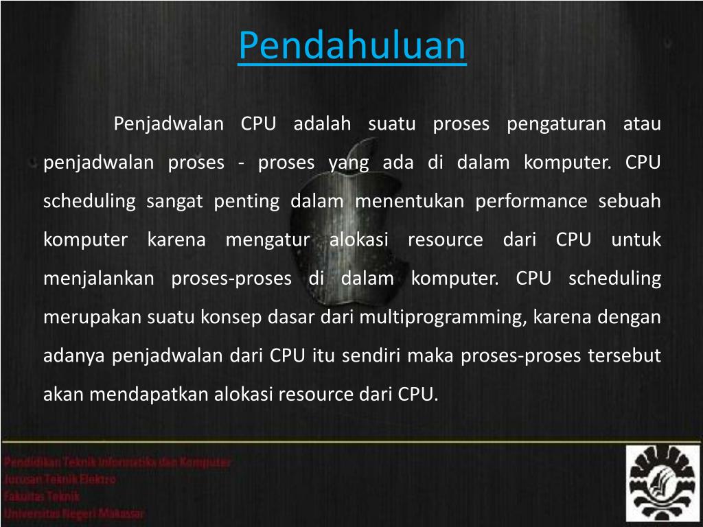 Pendahuluan PenjadwalanCPU adalahsuatu proses pengaturanataupenjadwalan proses - proses yang adadi dalamkomputer. CPU scheduling sangatpentingdalammenentukan performance sebuahkomputerkarenamengaturalokasi resource dari CPU untukmenjalankan proses-proses di dalamkomputer. CPU scheduling merupakansuatukonsepdasardari multiprogramming, karenadenganadanyapenjadwalandari CPU itusendirimaka proses-proses tersebutakanmendapatkanalokasiresource dariCPU.