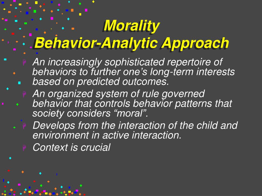 MoralityBehavior-Analytic Approach • An increasingly sophisticated repertoire of behaviors to further one’s long-term interests based on predicted outcomes. • An organized system of rule governed behavior that controls behavior patterns that society considers “moral”. • Develops from the interaction of the child and environment in active interaction. • Context is crucial