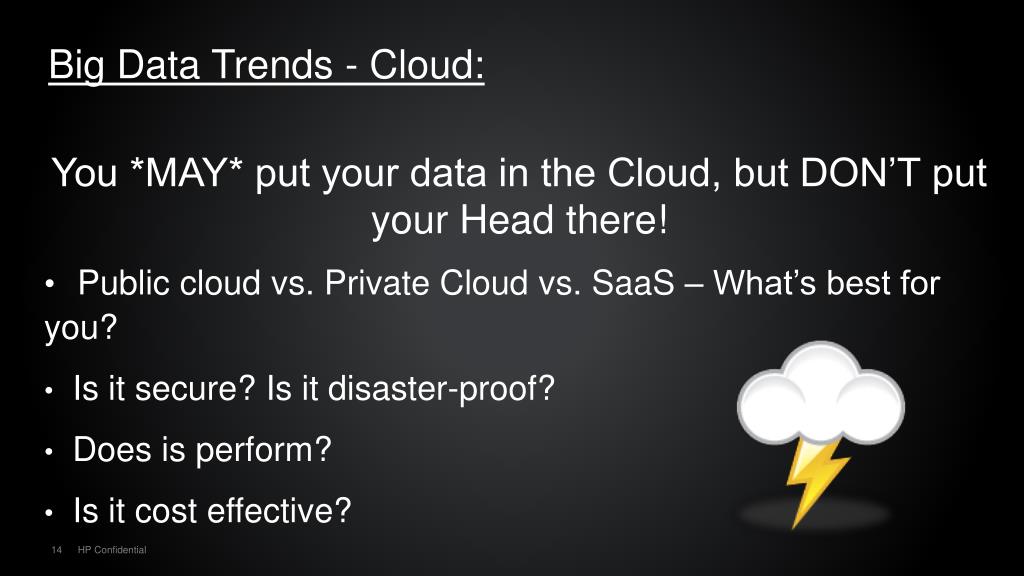 Big Data Trends - Cloud: • You *MAY* put your data in the Cloud, but DON’T put your Head there! • Public cloud vs. Private Cloud vs. SaaS – What’s best for you? • Is it secure? Is it disaster-proof? • Does is perform? • Is it cost effective?