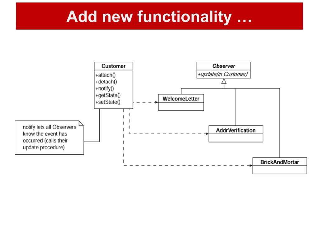 class WelcomeLetter implements MyObserver { public WelcomeLetter () { } public void update (Customer myCust) { /*do Welcome Letter stuff // here can get more information about customer // in question by using myCust */ } } //end of class WelcomeLetter