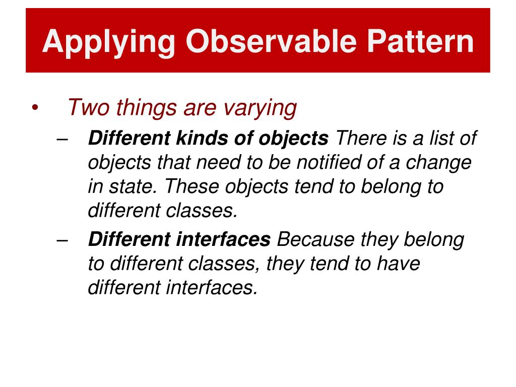 Applying Observable Pattern • Two things are varying • Different kinds of objects There is a list of objects that need to be notified of a change in state. These objects tend to belong to different classes. • Different interfaces Because they belong to different classes, they tend to have different interfaces.