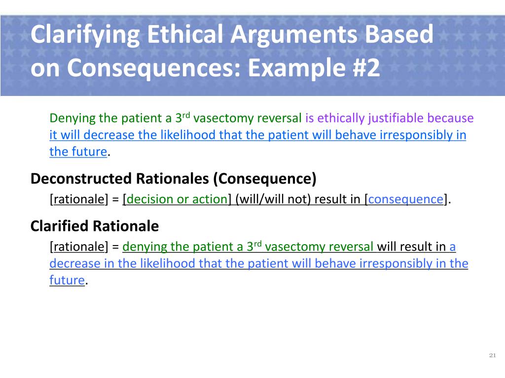 Clarifying Ethical Arguments Basedon Consequences: Example #2 Denying the patient a 3rd vasectomy reversal is ethically justifiable because it will decrease the likelihood that the patient will behave irresponsibly in the future. Deconstructed Rationales (Consequence) [rationale] = [decision or action] (will/will not) result in [consequence]. Clarified Rationale [rationale] = denying the patient a 3rd vasectomy reversal will result in a decrease in the likelihood that the patient will behave irresponsibly in the future.
