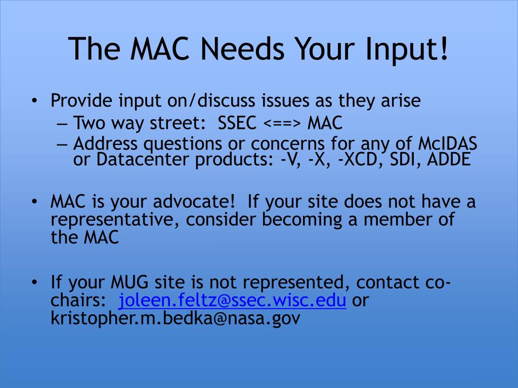 The MAC Needs Your Input! • Provide input on/discuss issues as they arise • Two way street: SSEC <==> MAC • Address questions or concerns for any of McIDAS or Datacenter products: -V, -X, -XCD, SDI, ADDE • MAC is your advocate! If your site does not have a representative, consider becoming a member of the MAC • If your MUG site is not represented, contact co-chairs: joleen.feltz@ssec.wisc.edu or kristopher.m.bedka@nasa.gov