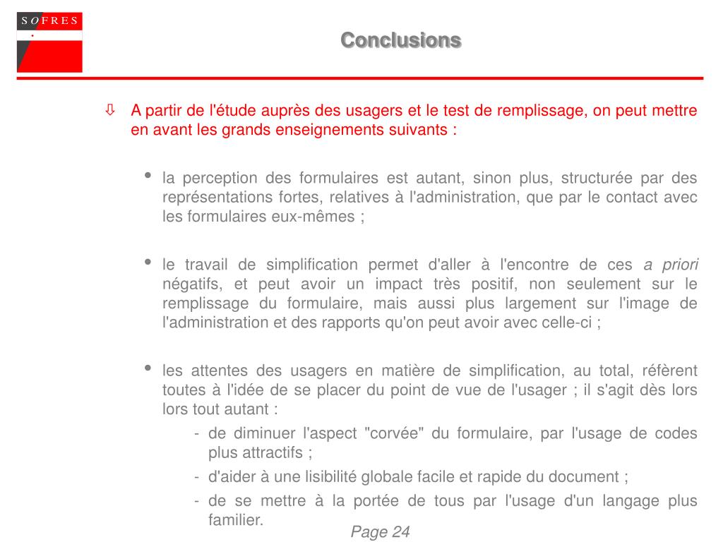 Conclusions • A partir de l'étude auprès des usagers et le test de remplissage, on peut mettre en avant les grands enseignements suivants : • la perception des formulaires est autant, sinon plus, structurée par des représentations fortes, relatives à l'administration, que par le contact avec les formulaires eux-mêmes ; • le travail de simplification permet d'aller à l'encontre de ces a priori négatifs, et peut avoir un impact très positif, non seulement sur le remplissage du formulaire, mais aussi plus largement sur l'image de l'administration et des rapports qu'on peut avoir avec celle-ci ; • les attentes des usagers en matière de simplification, au total, réfèrent toutes à l'idée de se placer du point de vue de l'usager ; il s'agit dès lors lors tout autant : • - de diminuer l'aspect "corvée" du formulaire, par l'usage de codes plus attractifs ; • - d'aider à une lisibilité globale facile et rapide du document ; • - de se mettre à la portée de tous par l'usage d'un langage plus familier.