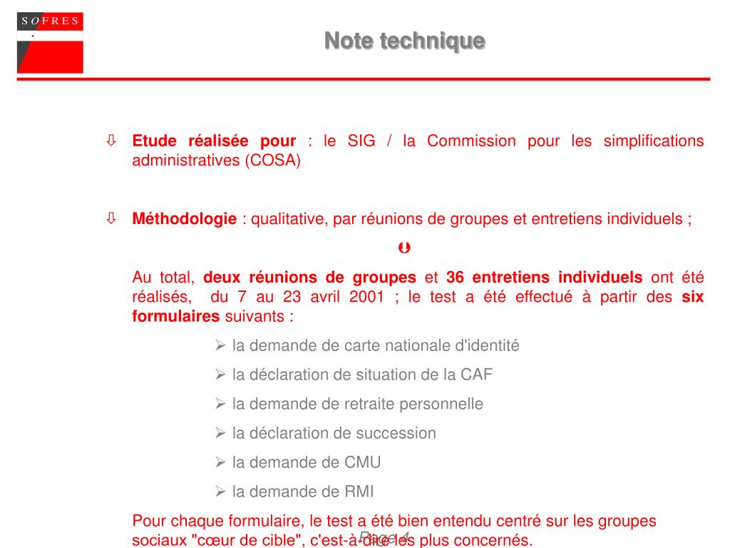 Note technique • Etude réalisée pour : le SIG / la Commission pour les simplifications administratives (COSA) • Méthodologie : qualitative, par réunions de groupes et entretiens individuels ; Au total, deux réunions de groupes et 36 entretiens individuels ont été réalisés, du 7 au 23 avril 2001 ; le test a été effectué à partir des six formulaires suivants : • la demande de carte nationale d'identité • la déclaration de situation de la CAF • la demande de retraite personnelle • la déclaration de succession • la demande de CMU • la demande de RMI Pour chaque formulaire, le test a été bien entendu centré sur les groupes sociaux "cœur de cible", c'est-à-dire les plus concernés.