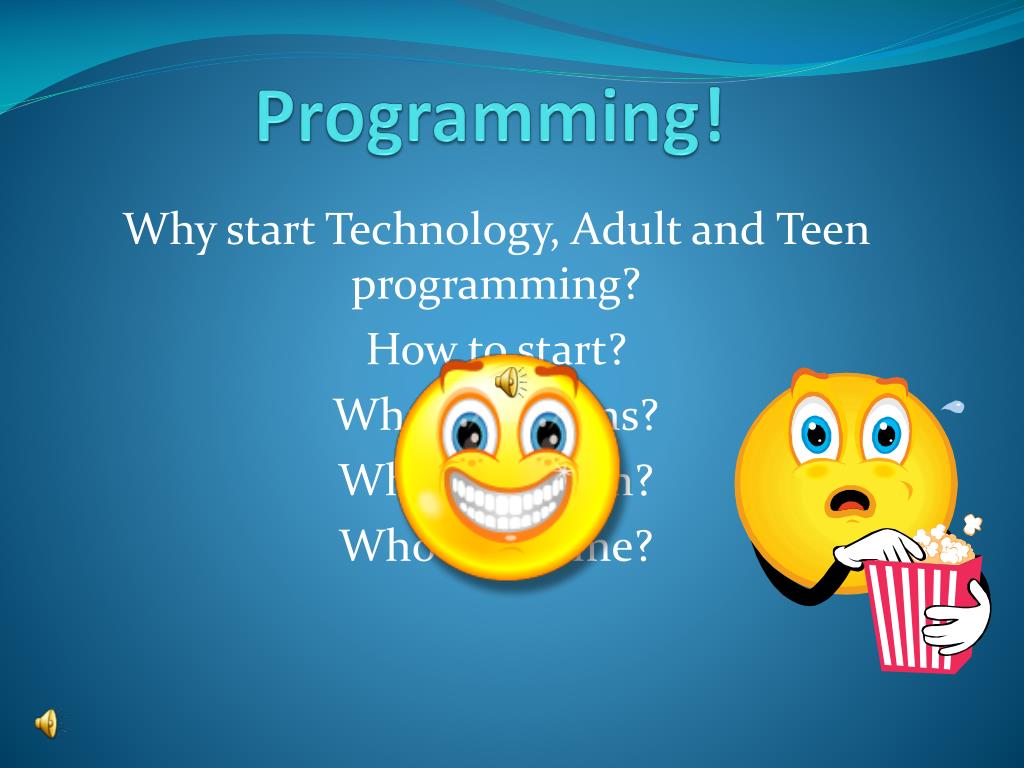 Programming! Why start Technology, Adult and Teen programming? How to start? What programs? Who will teach? Who will come?