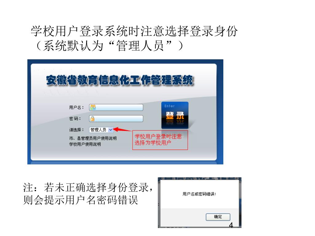 安徽教育信息化工作管理系统. 2014 年 10 月 合肥. 1. 一、系统简介及环境要求 系统地址: http://jyxxhgl.ahedu.gov.cn 建议在火狐浏览器或最新版 360 浏览器环境下使用。. 2. 二、系统使用说明 系统设有学校用户和管理员用户 2.1 学校用户 2.1.1 学校用户登录 打开浏览器在地址栏中输入系统地址 http://jyxxhgl.ahedu.gov.cn. 3. 学校用户登录系统时注意选择登录身份 (系统默认为“管理人员”). 注:若未正确选择身份登录, 则会提示用户名密码错误. 4.