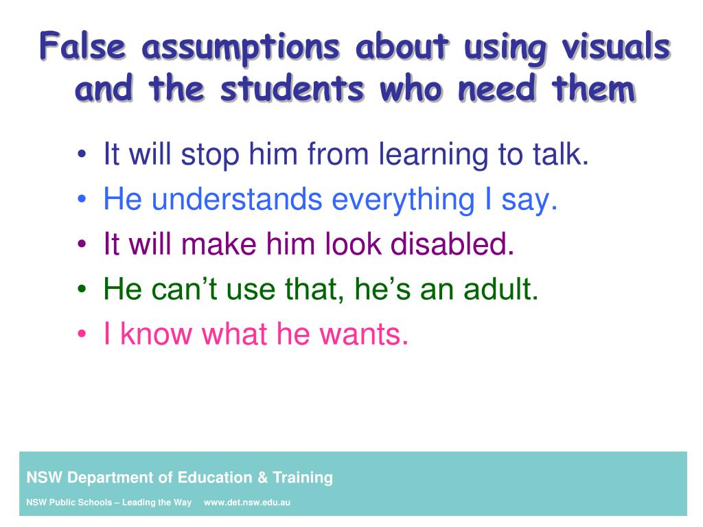 False assumptions about using visuals and the students who need them • It will stop him from learning to talk. • He understands everything I say. • It will make him look disabled. • He can’t use that, he’s an adult. • I know what he wants. NSW Department of Education & Training NSW Public Schools – Leading the Way www.det.nsw.edu.au