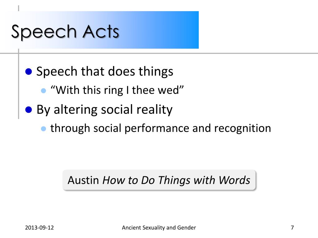 Speech Acts • Speech that does things • “With this ring I thee wed” • By altering social reality • through social performance and recognition Austin How to Do Things with Words Ancient Sexuality and Gender
