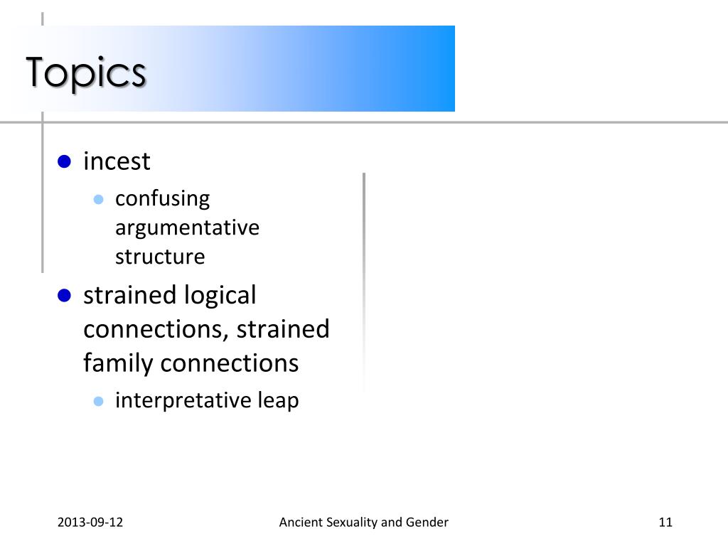 Topics • incest • confusing argumentative structure • strained logical connections, strained family connections • interpretative leap Ancient Sexuality and Gender