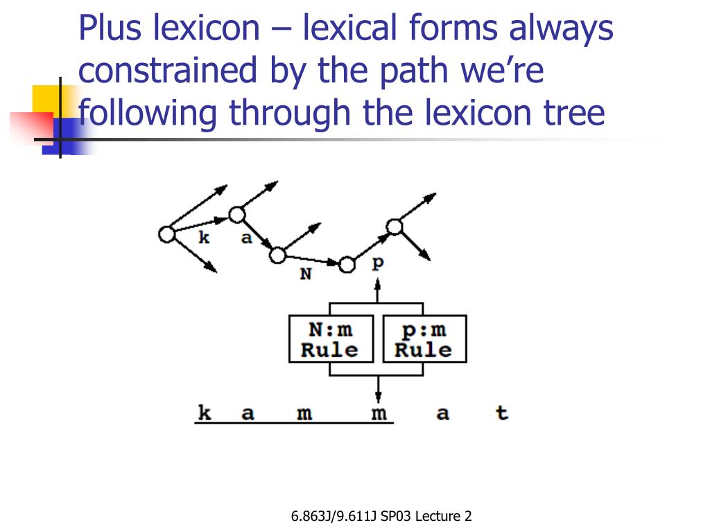 Plus lexicon – lexical forms always constrained by the path we’re following through the lexicon tree 6.863J/9.611J SP03 Lecture 2