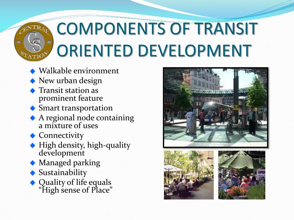COMPONENTS OF TRANSIT ORIENTED DEVELOPMENT • Walkable environment • New urban design • Transit station as prominent feature • Smart transportation • A regional node containing a mixture of uses • Connectivity • High density, high-quality development • Managed parking • Sustainability • Quality of life equals“High sense of Place”
