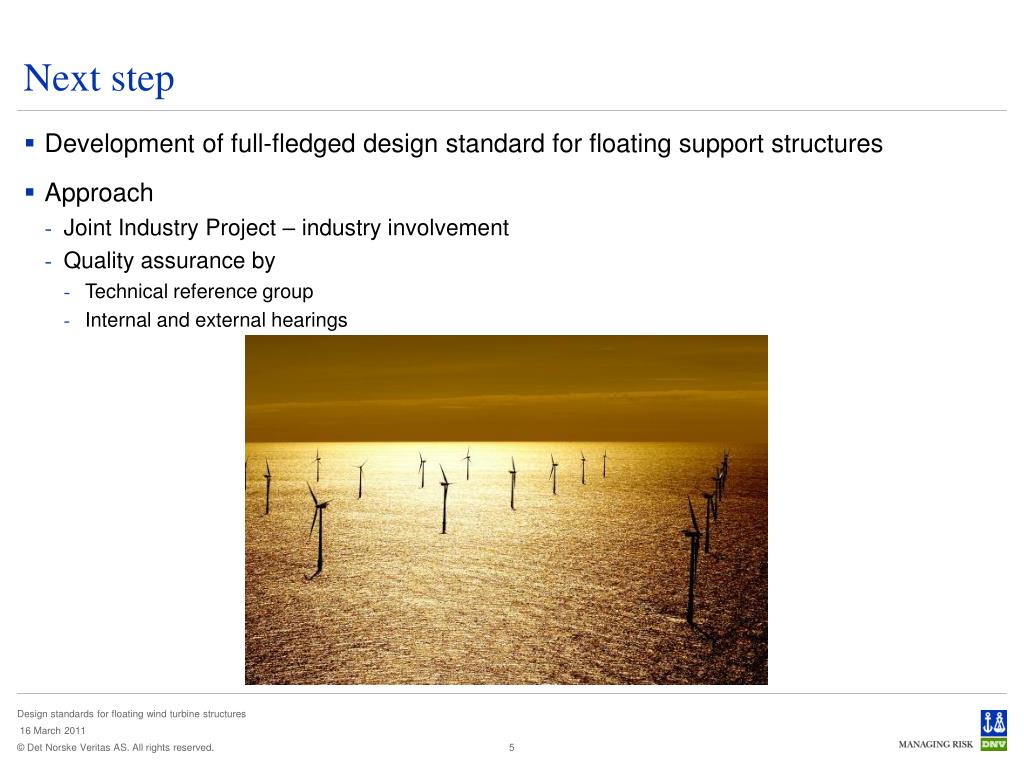 Next step • Development of full-fledged design standard for floating support structures • Approach • Joint Industry Project – industry involvement • Quality assurance by • Technical reference group • Internal and external hearings