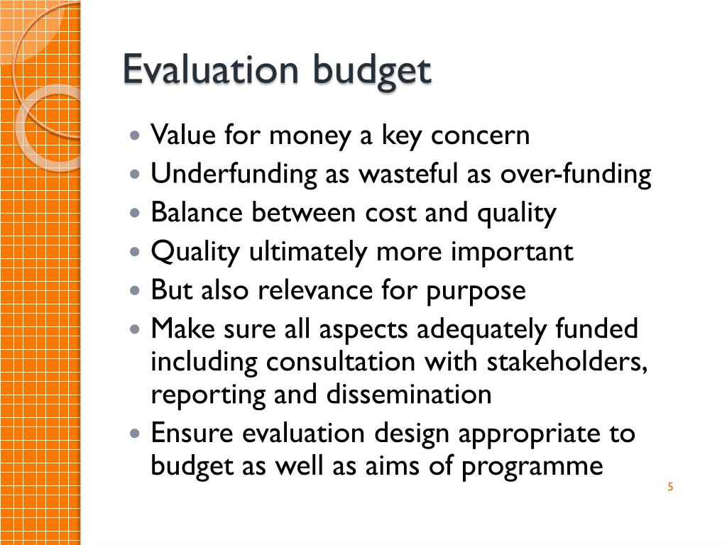 Evaluation budget Value for money a key concern Underfunding as wasteful as over-funding Balance between cost and quality Quality ultimately more important But also relevance for purpose Make sure all aspects adequately funded including consultation with stakeholders, reporting and dissemination Ensure evaluation design appropriate to budget as well as aims of programme