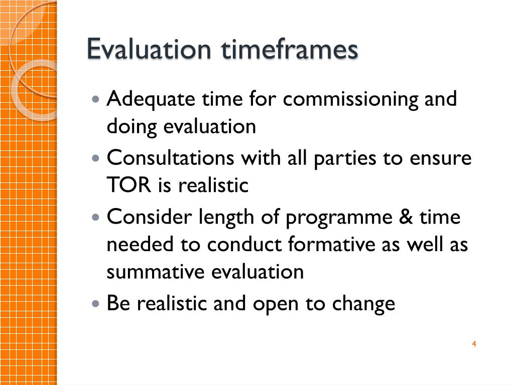 Evaluation timeframes Adequate time for commissioning and doing evaluation Consultations with all parties to ensure TOR is realistic Consider length of programme & time needed to conduct formative as well as summative evaluation Be realistic and open to change