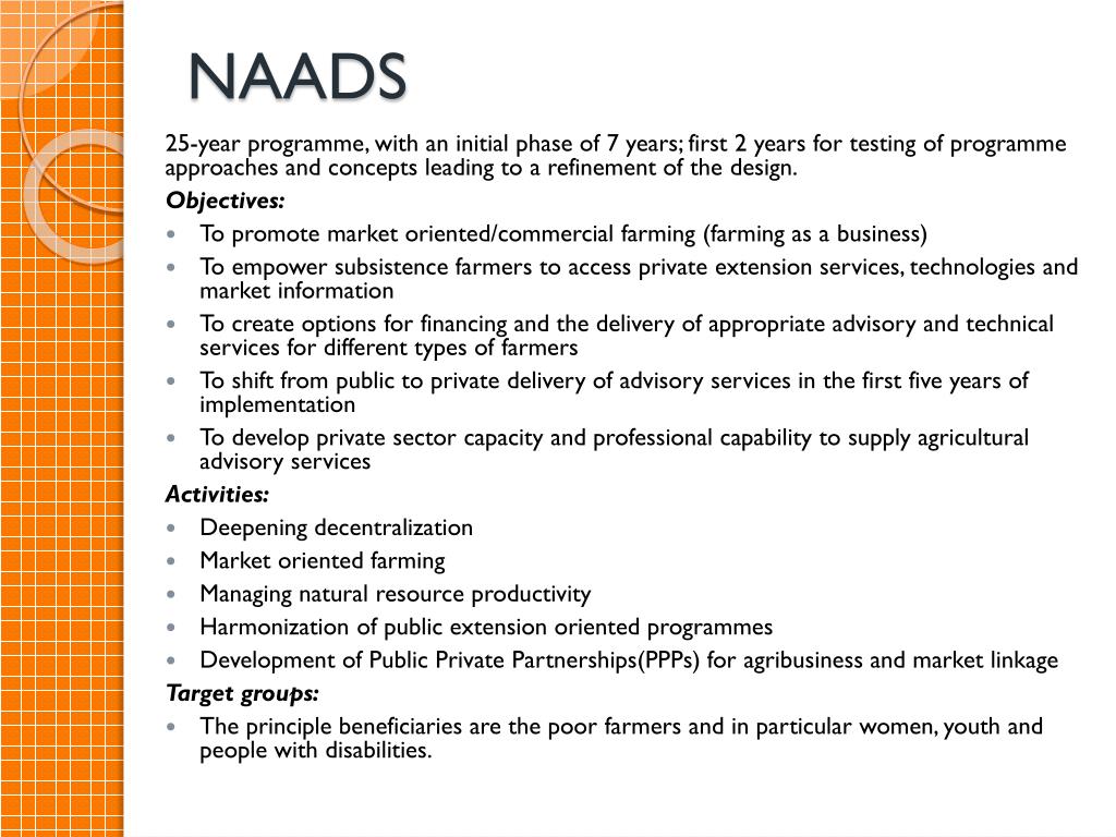 NAADS 25-year programme, with an initial phase of 7 years; first 2 years for testing of programme approaches and concepts leading to a refinement of the design. Objectives: • To promote market oriented/commercial farming (farming as a business) • To empower subsistence farmers to access private extension services, technologies and market information • To create options for financing and the delivery of appropriate advisory and technical services for different types of farmers • To shift from public to private delivery of advisory services in the first five years of implementation • To develop private sector capacity and professional capability to supply agricultural advisory services Activities: • Deepening decentralization • Market oriented farming • Managing natural resource productivity • Harmonization of public extension oriented programmes • Development of Public Private Partnerships(PPPs) for agribusiness and market linkage Target groups: • The principle beneficiaries are the poor farmers and in particular women, youth and people with disabilities.