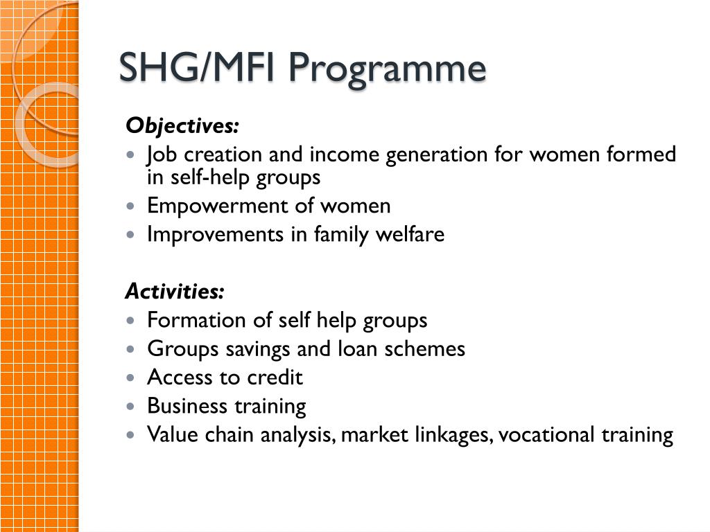 SHG/MFI Programme Objectives: • Job creation and income generation for women formed in self-help groups • Empowerment of women • Improvements in family welfare Activities: • Formation of self help groups • Groups savings and loan schemes • Access to credit • Business training • Value chain analysis, market linkages, vocational training