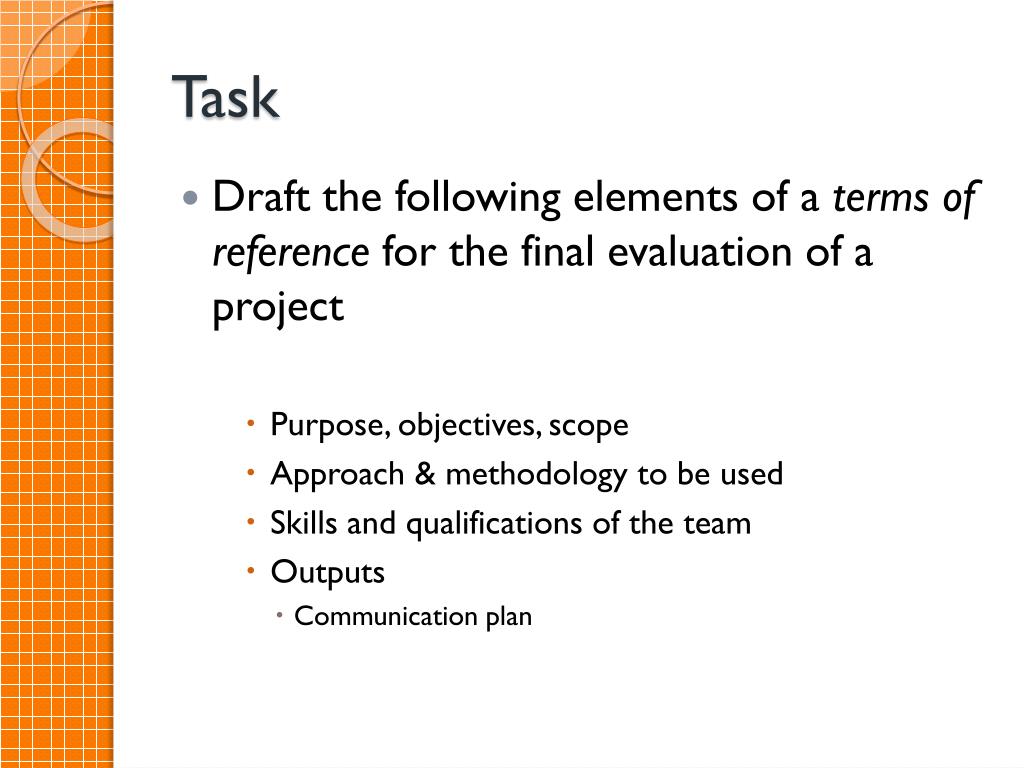 Task • Draft the following elements of a terms of reference for the final evaluation of a project • Purpose, objectives, scope • Approach & methodology to be used • Skills and qualifications of the team • Outputs • Communication plan