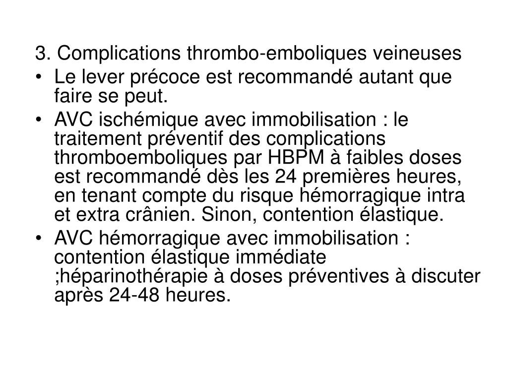 3. Complications thrombo-emboliques veineuses • Le lever précoce est recommandé autant que faire se peut. • AVC ischémique avec immobilisation : le traitement préventif des complications thromboemboliques par HBPM à faibles doses est recommandé dès les 24 premières heures, en tenant compte du risque hémorragique intra et extra crânien. Sinon, contention élastique. • AVC hémorragique avec immobilisation : contention élastique immédiate ;héparinothérapie à doses préventives à discuter après 24-48 heures.
