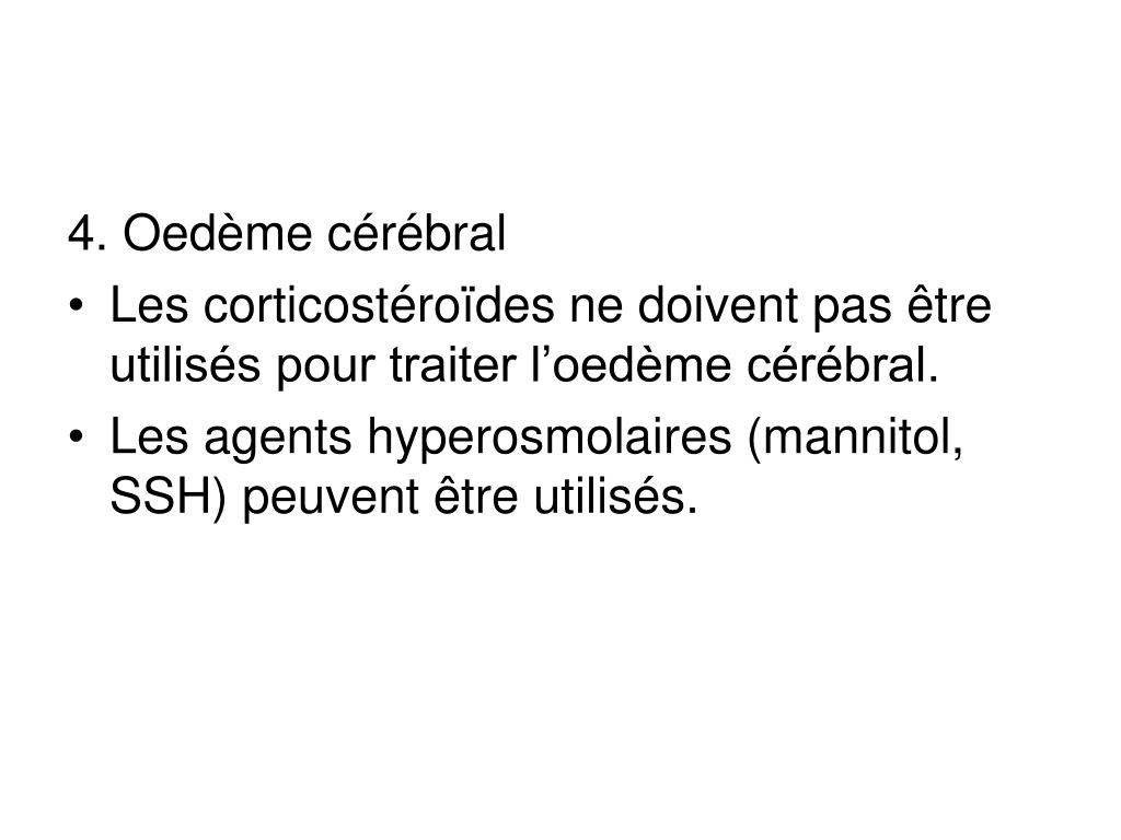 4. Oedème cérébral • Les corticostéroïdes ne doivent pas être utilisés pour traiter l’oedème cérébral. • Les agents hyperosmolaires (mannitol, SSH) peuvent être utilisés.